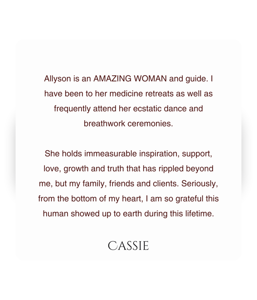 Allyson is a devoted medicine woman whose soul work centers on living and leading through unconditional love. Rising from the ashes of addiction, sexual trauma, and disordered eating, she transformed her wounds into sacred initiation. Through her own healing, she discovered her calling as a ceremonial guide, healer, and sister for women reclaiming their power and wholeness. She weaves ancient and embodied modalities, shamanic breathwork, plant medicine, sonic alchemy, and sacred sexuality, to create experiences that awaken and liberate the life force within.